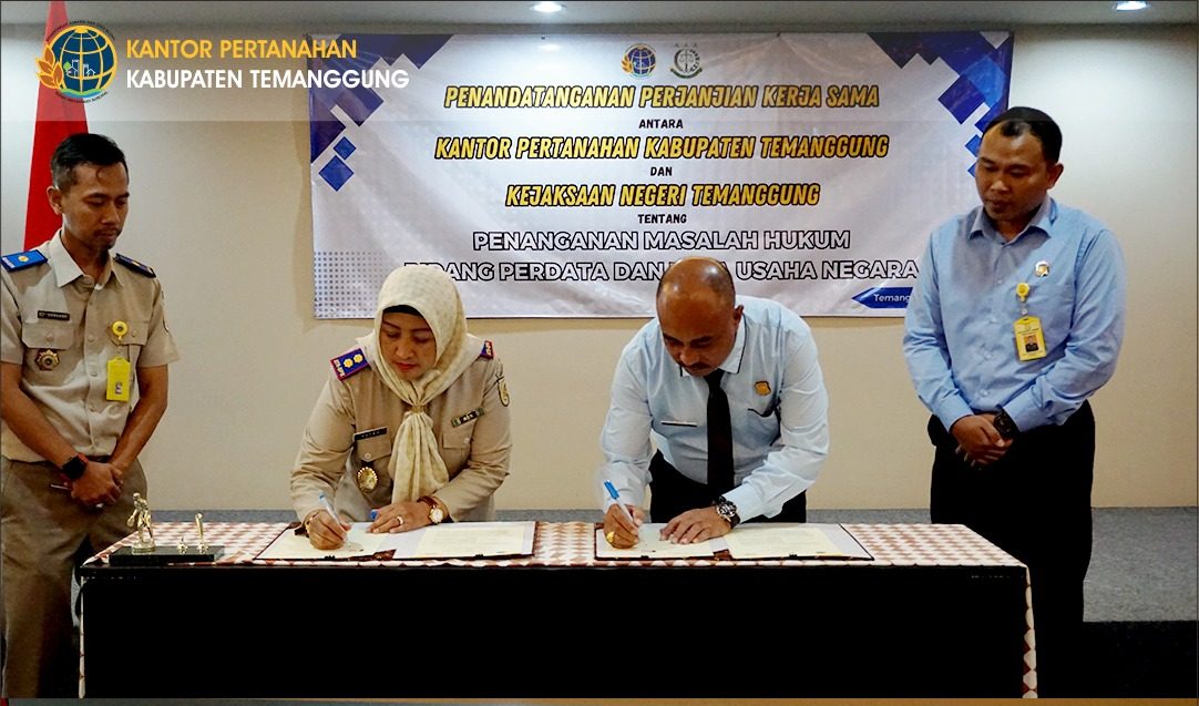 Temanggung, Kabartemanggung.com – Kantor Pertanahan Kabupaten Temanggung (BPN Temanggungt) merupakan instansi vertikal yang berada dibawah dan bertanggungjawab kepada Menteri Agraria dan Tata Ruang/ Kepala Badan Pertanahan Nasional melalui Kepala Kantor Wilayah Badan Pertanahan Nasional Provinsi Jawa Tengah. Pada Senin, (10/03/2025), bertempat di Ballroom Front One Temanggung, Kantor Pertanahan Temanggung melaksanakan Perjanjian Kerja Sama (PKS) dengan Kejaksaan Negeri Temanggung tentang penanganan masalah hukum bidang perdata dan tata usaha negara dengan menitikbertakan pada kerja sama dan koordinasi dalam rangka mendukung dan mengoptimalkan pelaksanaan tugas dan fungsi masing-masing sebagaimana diatur dalam peraturan perundang-undangan.