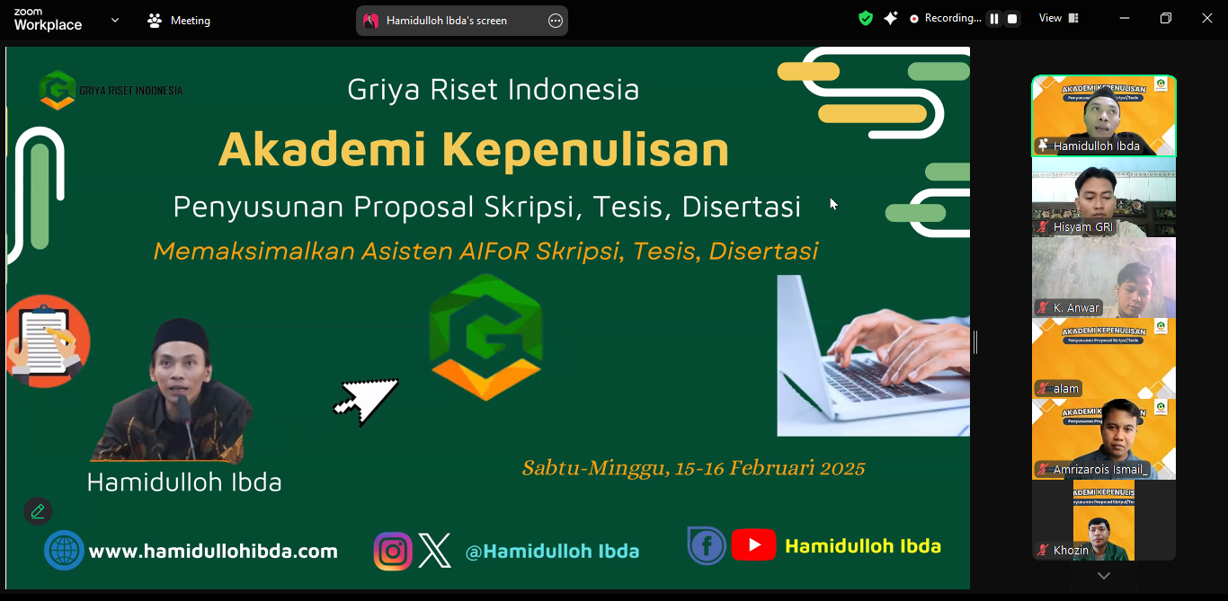 Semarang, Kabartemanggung.com – Griya Riset Indonesia (GRI) menggelar Akademi Kepenulisan bertajuk “Penyusunan Proposal Skripsi” dimulai Sabtu (14/2/2025) melalui Zoom Meeting dengan narasumber Dr. Hamidulloh Ibda, M.Pd., Reviewer 31 Jurnal Internasional terindeks Scopus, Editor Froentiers in Education terindeks Scopus Q1 yang juga Wakil Rektor Institut Islam Nahdlatul Ulama (Inisnu) Temanggung.