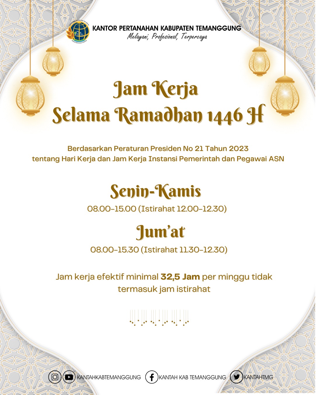 Temanggung, Kabartemanggung.com – Dalam rangka menyambut bulan suci Ramadhan 1446 H. Kantor Pertanahan Kabupaten Temanggung mengumumkan perubahan jam pelayanan loket. Berdasarkan Peraturan Presiden No. 21 Tahun 2023 tentang Hari Kerja dan Jam Kerja Instansi Pemerintah dan Pegawai ASN. Jam pelayanan Kantor Pertanahan Kabupaten Temanggung selama Ramadhan akan berlangsung sebagai berikut: