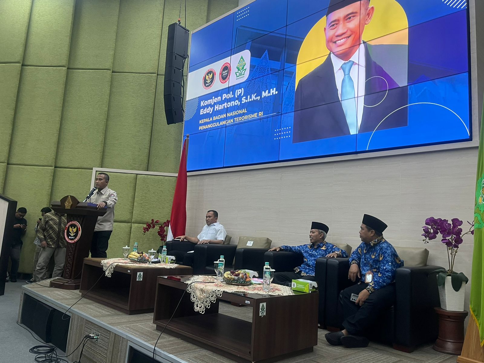 Semarang, Kabartemanggung.com – Kepala Badan Nasional Penanggulangan Terorisme (BNPT), Komjen Pol (Purn) Eddy Hartono, S.I.M., M.H., mengajak mahasiswa Universitas Islam Negeri (UIN) Walisongo Semarang untuk menjaga Indonesia dari ancaman radikalisme dan terorisme. “Ancaman terorisme di dunia siber itu nyata,” katanya dalam kegiatan Penguatan Kampus Kebangsaan “Jaga Kampus Kita” di Universitas Islam Negeri Walisongo Semarang melalui FKPT Jawa Tengah Tahun Anggaran 2025 di ruang Teaterikal Rektorat UIN Walosongo Semarang, Kamis (23/10/2025).